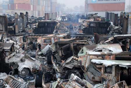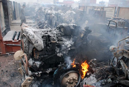 據(jù)轉(zhuǎn)運(yùn)站負(fù)責(zé)人介紹,大約300名武裝分子在黎明前用火箭筒炸開(kāi)倉(cāng)庫(kù)大門(mén),先打死一名值班警衛(wèi),然后就開(kāi)始放火燒車(chē)。很快就有106輛汽車(chē)葬身火海,其中包括70輛即將送給駐阿富汗美軍使用的悍馬吉普。在同增援的警方短暫交火后,武裝分子一哄而散,下落不明。