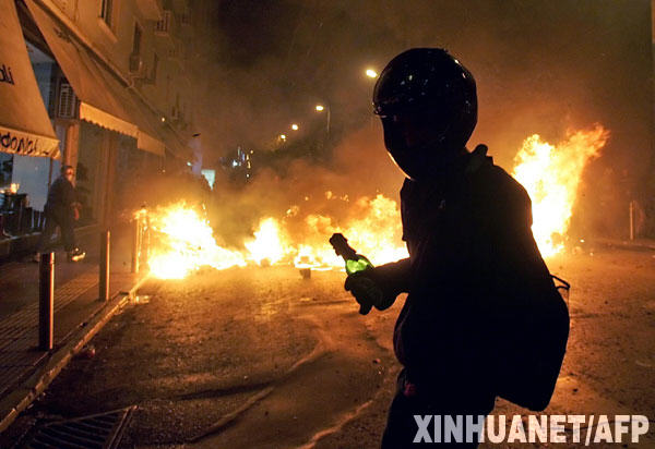 12月8日,一名示威者在希臘首都雅典的一個著火現(xiàn)場抗議。雅典市中心地區(qū)的騷亂爆發(fā)于6日晚,起因是警察打死一名15歲少年。目前騷亂仍在繼續(xù)。 新華社/法新
