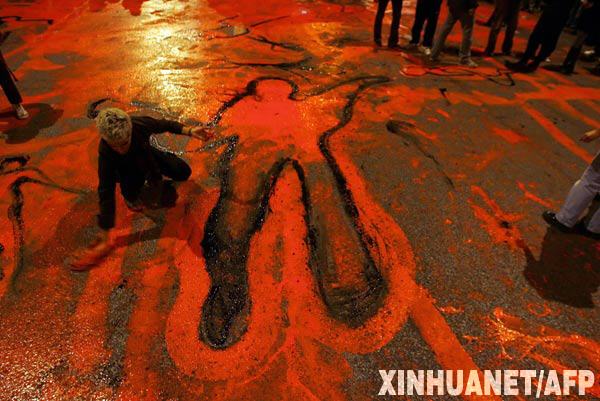 12月8日,在希臘首都雅典,示威者在地上涂抹紅色和黑色,象征死者和鮮血。雅典市中心地區(qū)的騷亂爆發(fā)于6日晚,起因是警察打死一名15歲少年。目前騷亂仍在繼續(xù)。 新華社/法新