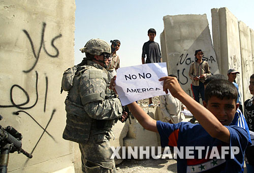 伊拉克巴格達街頭一名少年手舉反美標語抗議 新華社/法新