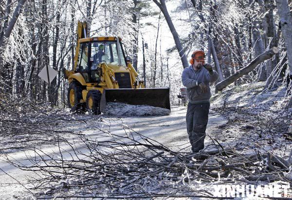 12月13日,在美國新罕布什爾州德里,一名男子在冰風(fēng)暴過后清理散落在路中央的樹枝。一場冰風(fēng)暴12日登陸美國新英格蘭地區(qū),造成大范圍電力供應(yīng)中斷和道路交通受阻。美國總統(tǒng)布什13日宣布,遭遇嚴(yán)重冰風(fēng)暴災(zāi)害的馬薩諸塞州北部進(jìn)入緊急狀態(tài)。 新華社發(fā)