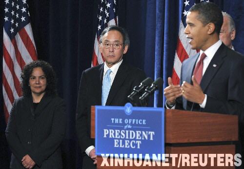 12月15日,美國當選總統(tǒng)奧巴馬(前右一)在芝加哥舉行的新聞發(fā)布會上宣布新政府能源環(huán)境團隊名單,其中華裔科學(xué)家、諾貝爾物理學(xué)獎得主朱棣文(中)被正式提名為能源部長。 新華社/路透