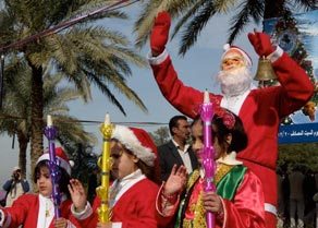 巴格達公園內(nèi)的圣誕節(jié),樣板意味濃厚,大舞臺上,一群兒童穿著代表不同種族和宗教的服裝,手拉手齊唱“建設(shè)伊拉克”。