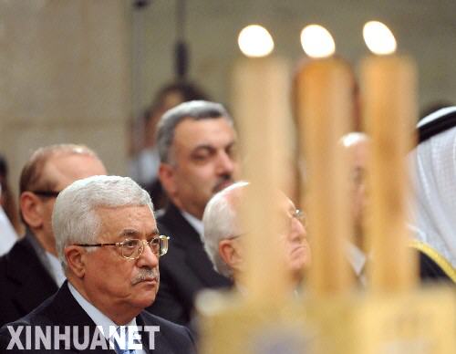 12月24日夜,巴勒斯坦民族權(quán)力機(jī)構(gòu)主席阿巴斯(左)在約旦河西岸城市伯利恒的圣凱瑟琳教堂出席圣誕節(jié)午夜彌撒。 新華社記者殷博古攝