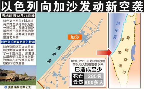 以軍27日中午開(kāi)始對(duì)加沙地帶發(fā)動(dòng)了幾十年來(lái)規(guī)模最大的空襲行動(dòng)。截至28日,空襲已造成約300人死亡、1000多人受傷。