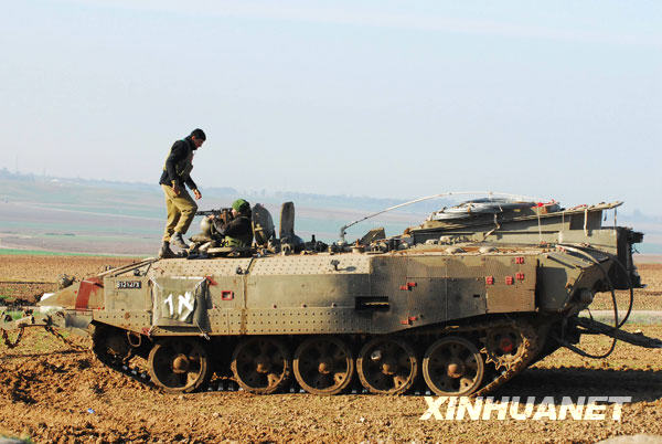 1月5日,在加沙北部邊境地區(qū),以色列士兵在裝甲車上警戒。當日,以色列軍隊繼續(xù)地面進攻加沙地帶,并已將加沙地帶分隔成南北兩塊區(qū)域。以軍發(fā)動的“鑄鉛”軍事行動目前已造成巴勒斯坦方面514人死亡,約2600人受傷。新華社發(fā)(拉菲爾攝)