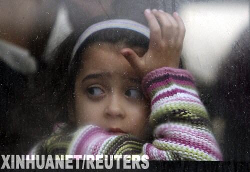 1月8日,一名準(zhǔn)備離開加沙地帶以躲避戰(zhàn)火的巴勒斯坦兒童從大巴中向外張望。 新華社/路透