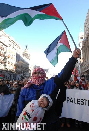 1月11日,在西班牙首都馬德里,一名男子懷抱死難兒童的人偶、高舉巴勒斯坦旗幟參加反戰(zhàn)游行。當(dāng)日,各界人士在馬德里舉行大規(guī)模反戰(zhàn)游行,抗議以色列軍隊在加沙的軍事行動。據(jù)組織者稱,共有25萬人參加了此次示威游行。 新華社記者陳海通攝