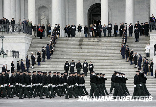 1月11日,在華盛頓舉行的美國當選總統(tǒng)奧巴馬就職典禮彩排中,美軍士兵在國會大廈外列隊行進。新華社/路透