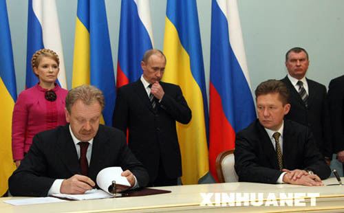 1月19日,俄羅斯總理普京(左三)、烏克蘭總理季莫申科(左一)、俄羅斯天然氣工業(yè)股份公司總裁米勒(左四)與烏克蘭石油天然氣公司總裁杜比納(左二)共同出席天然氣購(gòu)銷合同簽署儀式。當(dāng)日,俄羅斯天然氣工業(yè)股份公司與烏克蘭石油天然氣公司簽署了2009年至2019年天然氣購(gòu)銷合同。新華社記者沈伯韓攝