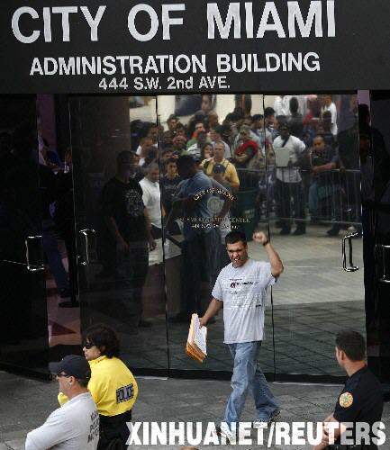 2月2日,在美國佛羅里達(dá)州的邁阿密,一名男子完成申請做消防員的手續(xù)后揮手慶祝。邁阿密市準(zhǔn)備新增35名消防員,并宣布只接受前750人的求職申請表。數(shù)百名申請者為能提交申請表在戶外排隊露營了三夜。 新華社/路透