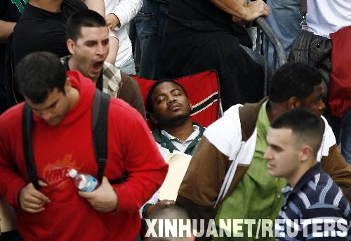 2月2日,在美國佛羅里達(dá)州的邁阿密,一名連夜排隊等待申請當(dāng)消防員的男子(中)坐在椅子上睡著了。邁阿密市準(zhǔn)備新增35名消防員,并宣布只接受前750人的求職申請表。數(shù)百名申請者為能提交申請表在戶外排隊露營了三夜。 新華社/路透