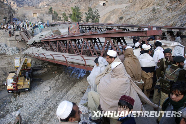 2月3日,在巴基斯坦西北邊境省首府白沙瓦以西大約23公里處,當(dāng)?shù)鼐用窬奂谝蛔徽У蔫F橋附近。當(dāng)天,不明身份武裝人員炸毀了這一連接阿富汗和巴基斯坦的開伯爾通道的重要橋梁,切斷了駐阿國際安全援助部隊和駐阿美軍物資運輸要道。新華社/路透