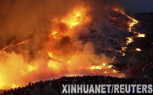 2月9日,在韓國(guó)昌寧郡,正月十五傳統(tǒng)的“燒蒲葦”活動(dòng)引發(fā)火災(zāi)。新華社/路透