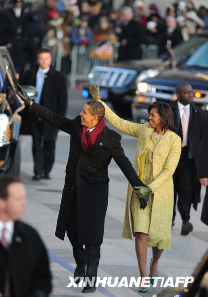 1月20日,在美國首都華盛頓,美國新任總統(tǒng)奧巴馬和其夫人米歇爾在總統(tǒng)就職慶祝游行中向民眾揮手致意。新華社/法新