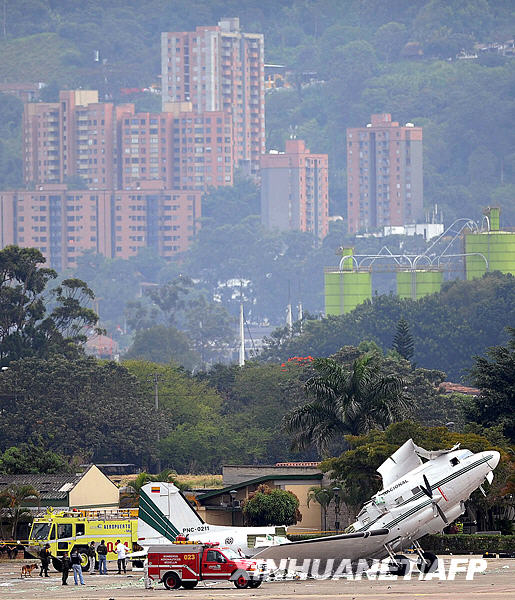 2月18日,在哥倫比亞麥德林的一個(gè)機(jī)場,一架發(fā)生爆炸的飛機(jī)殘骸癱在停機(jī)坪上。新華社/法新