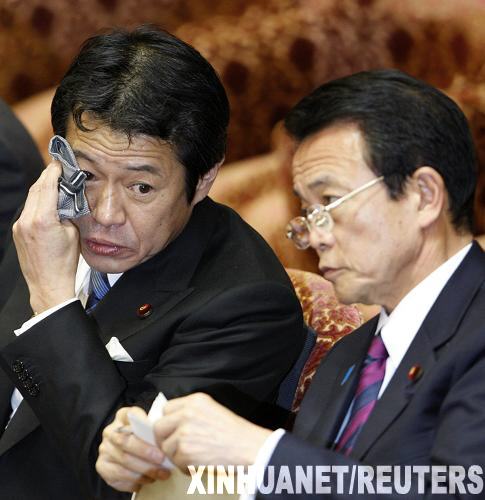 2月17日,在日本東京,日本財務大臣兼金融擔當大臣中川昭一(左)在出席眾議院會議時擦汗。據悉,中川昭一當日已向日本首相麻生太郎遞交辭呈。他因在西方七國財長和央行行長會議期間表現(xiàn)失態(tài)而遭到輿論指責。新華社/路透