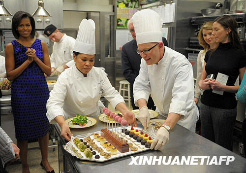 2月22日,在美國(guó)華盛頓白宮的廚房里,美國(guó)“第一夫人”米歇爾·奧巴馬(左)探望為宴請(qǐng)州長(zhǎng)的晚餐而忙碌的廚師們。新華社/法
