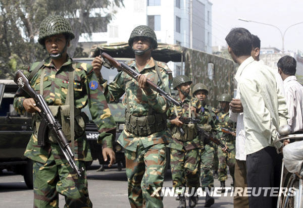2月25日,在孟加拉國(guó)首都達(dá)卡,士兵在“孟加拉國(guó)步槍隊(duì)”總部附近警戒。新華社/路透