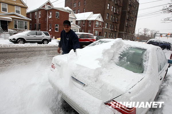 3月2日,美國(guó)紐約的一名市民清掃自家車上的積雪。