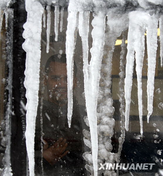 3月2日,在美國(guó)紐約,一名男子從掛滿冰柱的窗戶內(nèi)向外張望。新華社記者劉欣攝