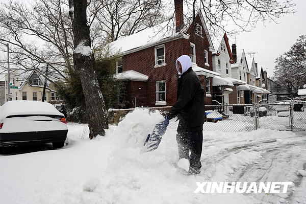 3月2日,在紐約皇后區(qū),一位市民清掃房前積雪。新華社記者谷欣容攝