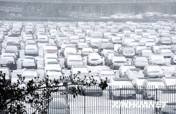 3月2日,在紐約拉瓜地機(jī)場(chǎng),眾多車輛滯留在停車場(chǎng)上。新華社記者谷欣容攝