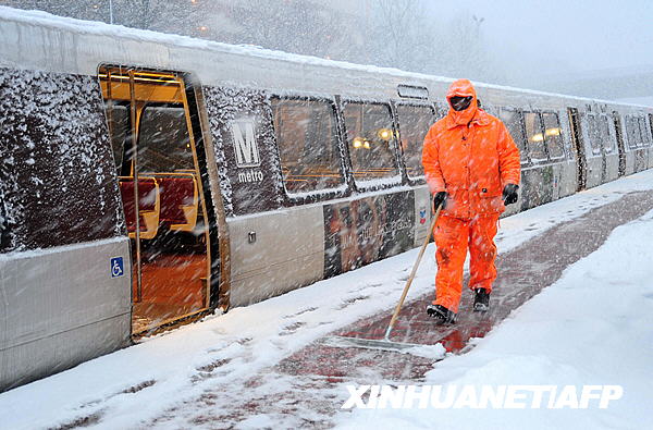 3月2日,在美國(guó)弗吉尼亞州維也納的一個(gè)城鐵站臺(tái)上,一名工人清掃積雪。新華社/法新