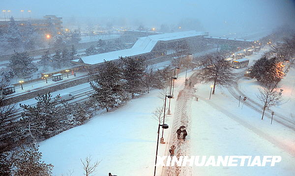 3月2日,在美國(guó)弗吉尼亞州維也納的一個(gè)城鐵站附近,行人冒雪步行。新華社/法新
