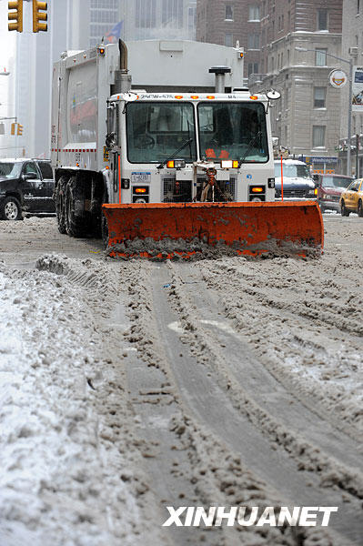 3月2日,鏟雪車在紐約曼哈頓的道路上清理積雪。美國(guó)東部地區(qū)從1日夜開始遭受史上3月份罕見大雪襲擊。紐約市出動(dòng)大約2000名環(huán)衛(wèi)工人投入到除雪等工作中,雖然大雪給市民出行造成不便,但城市公交系統(tǒng)總體運(yùn)行正常。新華社記者申宏攝
