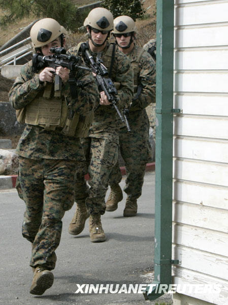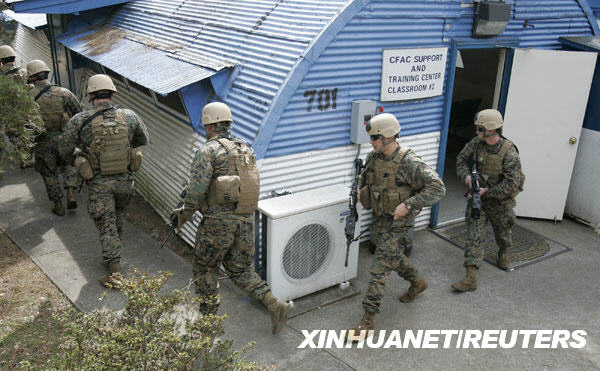 3月9日,在韓國首都首爾東南410公里的鎮(zhèn)海美軍基地,美國海軍陸戰(zhàn)隊太平洋反恐安全小組參加演習(xí)。新華社/路透