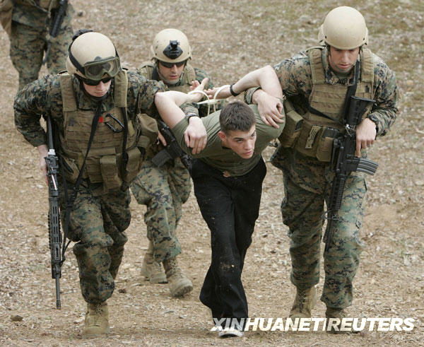 3月9日,在韓國首都首爾東南410公里的鎮(zhèn)海美軍基地,美國海軍陸戰(zhàn)隊太平洋反恐安全小組的成員模擬抓捕“入侵者”。新華社/路透