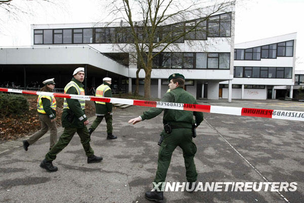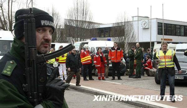 當天早上,斯圖加特市附近小鎮(zhèn)溫嫩登一所名為艾伯特維爾的中學發(fā)生嚴重校園槍擊案。據(jù)德國警方公布的傷亡數(shù)字,槍擊案導致包括槍手在內至少16人死亡。 新華社/路透