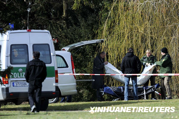 3月11日,在發(fā)生槍擊案的德國斯圖加特市附近小鎮(zhèn)溫嫩登一所名為艾伯特維爾的中學附近的公園,法醫(yī)將一具遇難者遺體抬離現(xiàn)場。新華社/路透