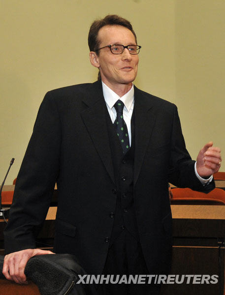 3月9日,瑞士男子黑爾格·斯加爾比在德國慕尼黑的法庭接受審判后與前來采訪的記者交談。