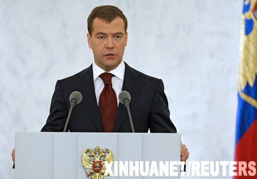 2008年11月5日,俄羅斯總統(tǒng)梅德韋杰夫在首都莫斯科的克里姆林宮向議會(huì)兩院發(fā)表國(guó)情咨文時(shí)提議,將俄總統(tǒng)任期從目前的4年延長(zhǎng)至6年,將國(guó)家杜馬(議會(huì)下院)議員任期從4年延長(zhǎng)至5年。新華社/路透