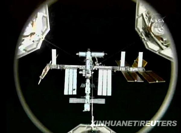 這張美國國家航空和航天局3月17日發(fā)布的電視截圖顯示,美國“發(fā)現(xiàn)”號航天飛機正在與國際空間站對接。美國東部時間17日17時19分(北京時間18日5時19分),美國“發(fā)現(xiàn)”號航天飛機成功與國際空間站對接。新華社/路透