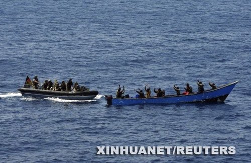 3月3日,在索馬里附近海域的亞丁灣,幾名德國海軍乘快艇靠近海盜的小船。德國海軍驅逐艦“萊茵蘭—普法爾茨”號當天在索馬里附近海域的亞丁灣擊退一次海盜襲擊并抓獲9名海盜。
