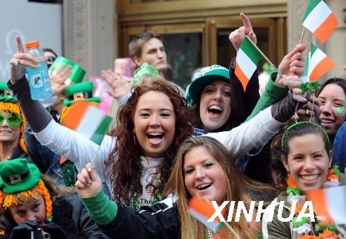 3月17日,在美國(guó)紐約曼哈頓,觀眾興奮地和圣帕特里克節(jié)游行隊(duì)伍打招呼。當(dāng)日,紐約舉行盛大游行,慶祝圣帕特里克節(jié)。圣帕特里克節(jié)是愛(ài)爾蘭人紀(jì)念?lèi)?ài)爾蘭守護(hù)神圣帕特里克的節(jié)日,至今已有1500多年歷史,這一節(jié)慶傳統(tǒng)被愛(ài)爾蘭移民帶入美國(guó)。新華社記者 申宏 攝