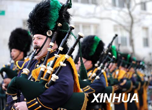 3月17日,在美國(guó)紐約曼哈頓,愛(ài)爾蘭樂(lè)手在圣帕特里克節(jié)游行中表演。當(dāng)日,紐約舉行盛大游行,慶祝圣帕特里克節(jié)。圣帕特里克節(jié)是愛(ài)爾蘭人紀(jì)念?lèi)?ài)爾蘭守護(hù)神圣帕特里克的節(jié)日,至今已有1500多年歷史,這一節(jié)慶傳統(tǒng)被愛(ài)爾蘭移民帶入美國(guó)。新華社記者 申宏 攝