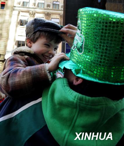 3月17日,在美國(guó)紐約曼哈頓,一名男孩為父親戴上喜慶的綠色帽子。當(dāng)日,紐約舉行盛大游行活動(dòng)慶祝圣帕特里克節(jié)。圣帕特里克節(jié)是愛(ài)爾蘭人紀(jì)念?lèi)?ài)爾蘭守護(hù)神圣帕特里克的節(jié)日,至今已有1500多年歷史,這一節(jié)慶傳統(tǒng)被愛(ài)爾蘭移民帶入美國(guó)。新華社記者 谷欣容攝