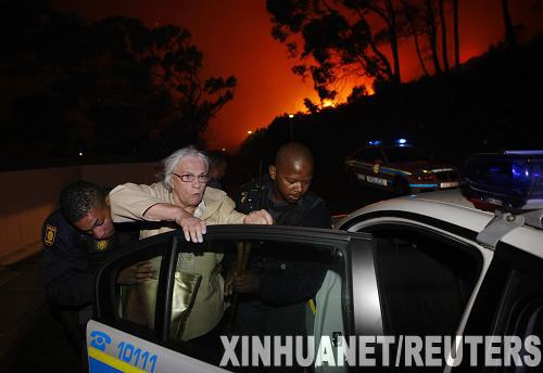 3月18日,在南非開普敦發(fā)生森林火災(zāi)的山區(qū),警察正在疏散當(dāng)?shù)鼐用。大火致使?dāng)?shù)鼐用駭?shù)百人被迫疏散。新華社/路透