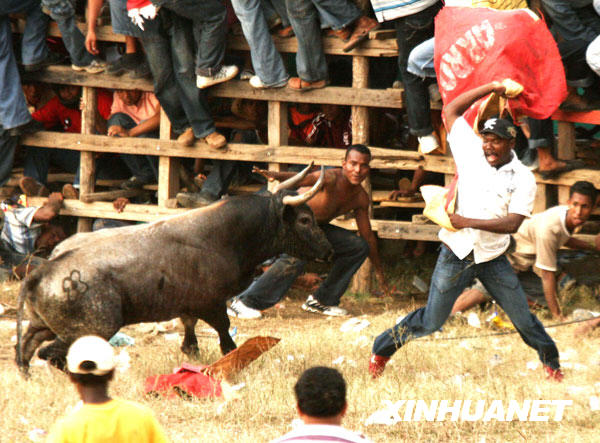 阿爾霍納小鎮(zhèn)舉行的民間斗牛節(jié)是由當(dāng)?shù)囟放酆谜邊⒓拥囊豁椈顒,在?dāng)?shù)匾延猩习倌甑臍v史,因其場面驚險刺激,每次斗牛都能吸引成千上萬名觀眾前來觀看。新華社發(fā)(胡安·佩雷斯攝)