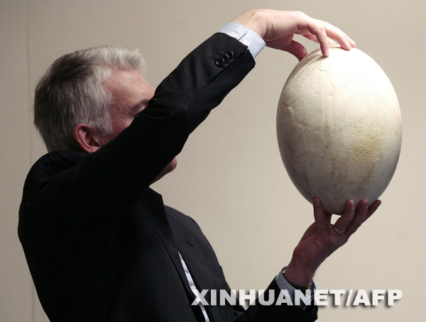 3月25日,一名男子在英國倫敦展示一枚據(jù)稱是“世界上最大的蛋”。這枚由已經(jīng)滅絕的馬達(dá)加斯加象鳥在十七世紀(jì)產(chǎn)下的蛋,將在當(dāng)天舉行的切爾西古董展上出售,標(biāo)價(jià)5000英鎊(約合7340美元)。新華社/法新
