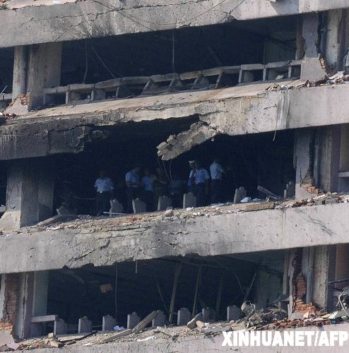 資料圖片: 2009年2月21日,在斯里蘭卡首都科倫坡,安全人員在遭到飛機(jī)撞擊的稅務(wù)部大樓內(nèi)勘查?苽惼20日晚遭到反政府武裝泰米爾伊拉姆猛虎解放組織(猛虎組織)空襲,一架猛虎組織飛機(jī)被擊落,另一架飛機(jī)被擊中后墜落在斯稅務(wù)部大樓上?苽惼聡⑨t(yī)院醫(yī)生赫克托·維拉辛哈向媒體稱,空襲導(dǎo)致4人喪生,51人受傷。新華社/法新