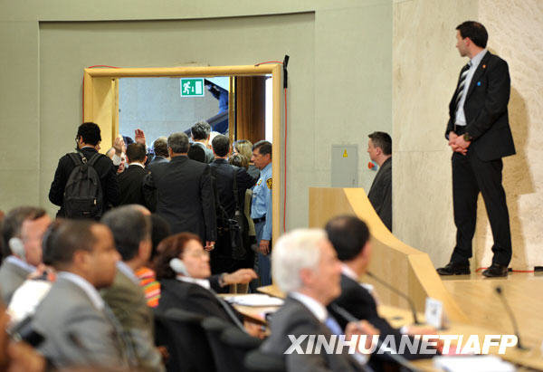 4月20日,在瑞士日內(nèi)瓦,來(lái)自歐盟國(guó)家的代表在伊朗總統(tǒng)艾哈邁迪-內(nèi)賈德發(fā)表講話期間離開(kāi)會(huì)場(chǎng)。新華社/法新