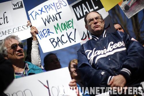 3月21日,在美國康涅狄格州美國國際集團(AIG)總部外,抗議者手舉“納稅人想要回他們的錢”等牌板。當天,康涅狄格州一個勞工團體組織金融危機受害者前往AIG總部,抗議AIG在接受美國政府巨額資金援助的情況下仍向部分高管和員工發(fā)放高額獎金。 新華社/路透