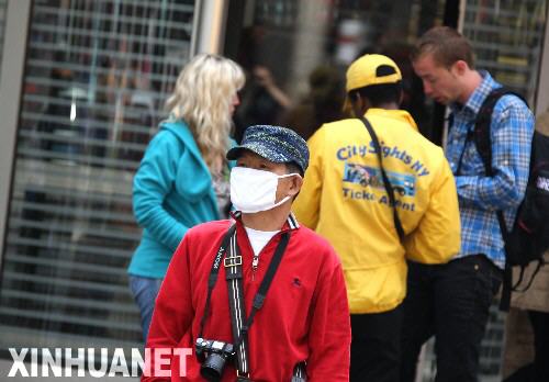 4月29日,一名戴著口罩的日本游客在美國紐約時報廣場觀光。當(dāng)日,美國疾病控制和預(yù)防中心代理主任理查德·貝塞爾表示,美國境內(nèi)確診的豬流感患者人數(shù)已經(jīng)上升至91人,其中包括一名現(xiàn)已死亡的墨西哥兒童。 新華社記者劉欣攝