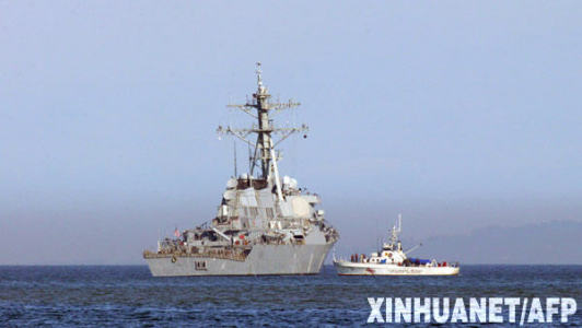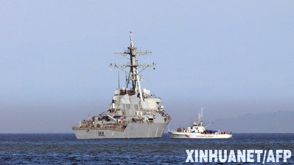 資料圖片:2008年11月22日,“巴里”號美軍驅(qū)逐艦停靠在格魯吉亞港口城市巴統(tǒng)附近。美國駐格魯吉亞使館發(fā)言人當(dāng)日說,“巴里”號驅(qū)逐艦隸屬美國海軍第六艦隊,原駐扎在意大利那不勒斯,22日抵達巴統(tǒng)訪問。艦上沒裝載人道主義救援物資,也沒裝載軍事援助物資。 新華社/法新