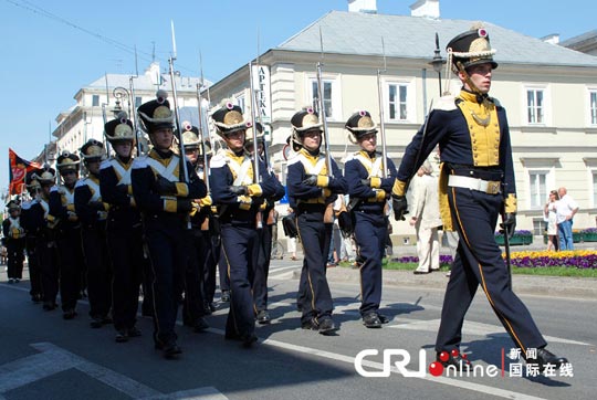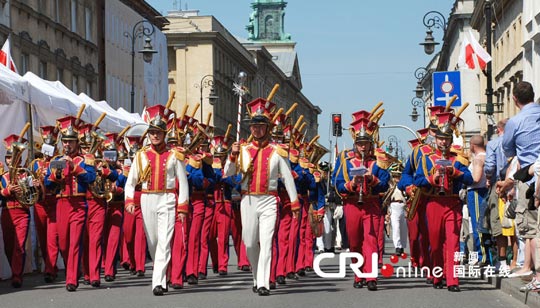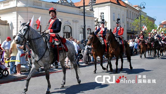 5月3日是波蘭的“憲法日”,波蘭首都華沙舉行了盛大的閱兵式。參加閱兵的有18、19世紀(jì)的波蘭傳統(tǒng)步、騎兵,波蘭當(dāng)代三軍儀仗隊(duì)、警察部隊(duì)以及童子軍等。軍隊(duì)從華沙王宮廣場(chǎng)出發(fā),沿皇家大道一直行進(jìn)到波蘭市中心,向沿途的眾多市民游客展示風(fēng)采。